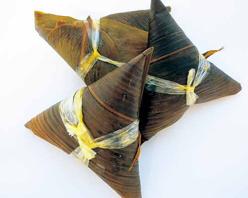 2葉は表を上にして2枚取り(大きければ1枚でも良い)、少しずらして重ね、三角にして、スプーンか杯等で米を入れる。こぼれないようにして、い草の紐で結ぶ。