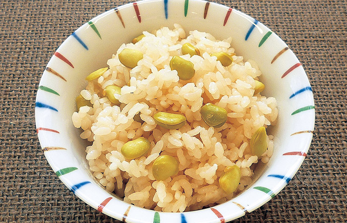 *枝豆を下ゆでし、豆のゆで汁と調味料のみを入れご飯を炊き、炊きあがったらゆでた豆を混ぜる方法もある。