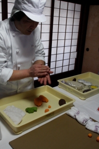 この度、鶴岡食文化女性リポーターとして娘と一緒に丙申堂にてお雛さまを鑑賞、住吉屋さんのご主人と一緒にこの練切を作りました。材料は白小豆、白インゲン、求肥をつなぎに入れ滑らかな口当たりにしていました。紅花や赤キャベツなどの天然色素で生地に着色します。鯛はめでたい、すくすく育つようにと筍。庄内柿、民田ナスなど地元産物、苺やサクランボなどもありました。その中で特に私たちの目に留まったのが、魚の切り身でした。