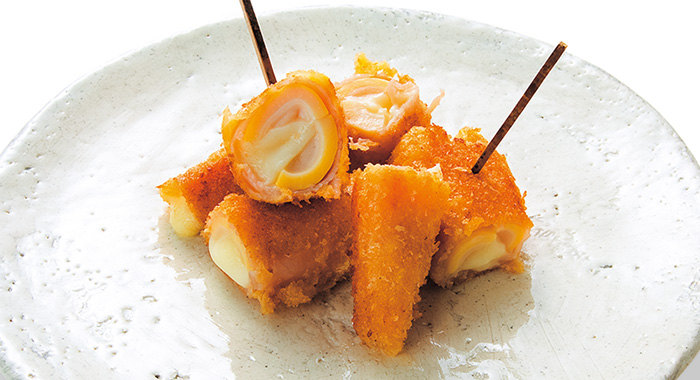 とろけたチーズとハム、孟宗の食感がなんとも絶妙。揚げたてをそのままほおばって。