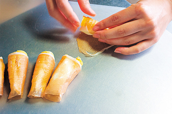 2孟宗2片でチーズを挟み、生ハムで巻く。